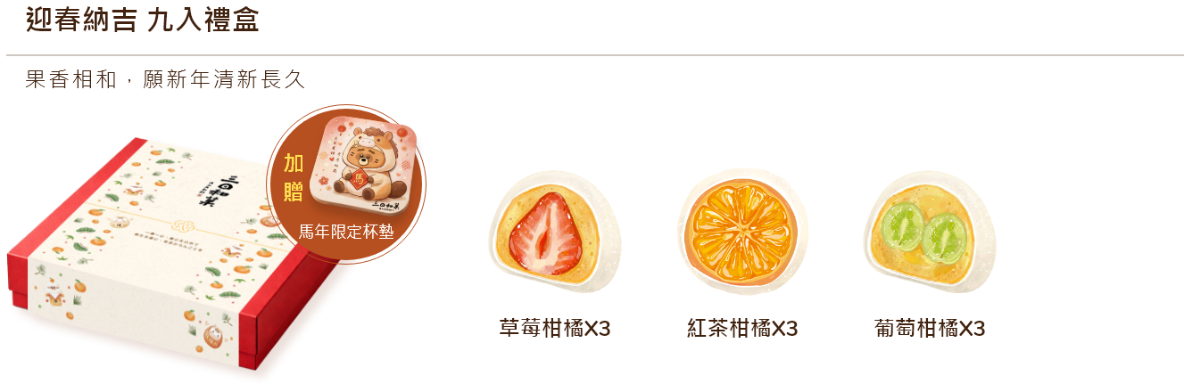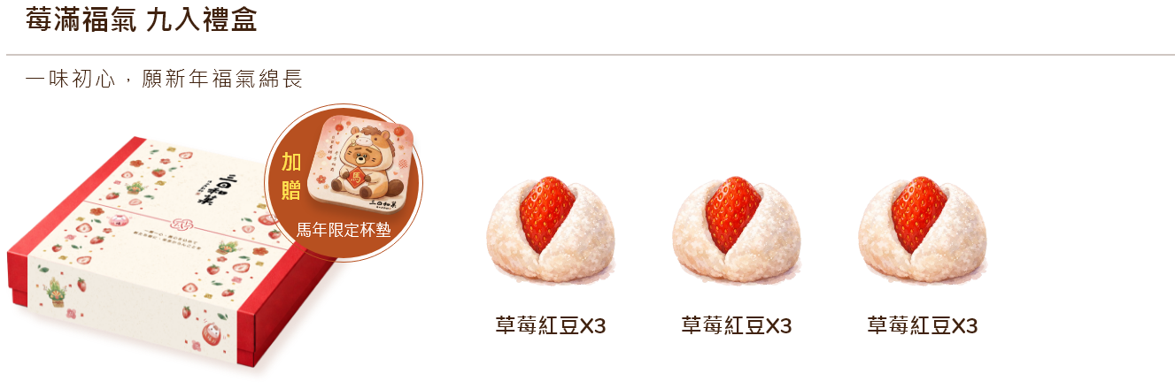 商品皆為新鮮製作,部分商品當日可常溫擺放,包含:草莓紅豆、草莓芋泥、草莓柑橘(豆沙)、抹茶草莓(豆沙)、巧克力草莓(豆沙)、葡萄柑橘(豆沙)。