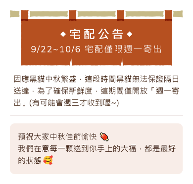 宅配商品皆採''黑貓冷藏配送'',出貨日為週五、週一 (當天配送;隔日到貨)